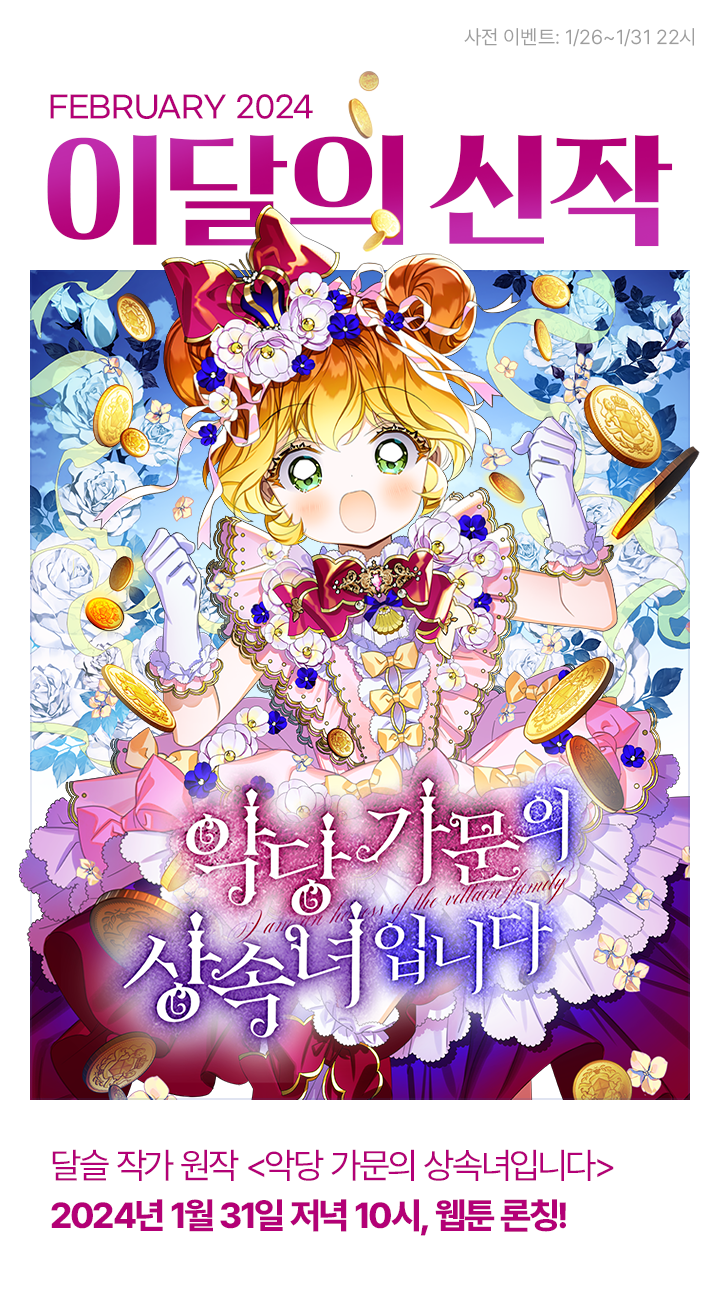 웹툰 <악당 가문의 상속녀입니다> 알림 신청하면 캐시 선물 + 시크릿 선발대 초대장 (최대 1,000캐시 뽑기권, 1천명 추첨, 2/1 푸시로 지급)