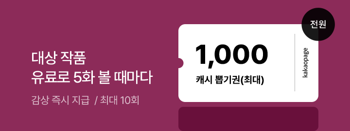 - 이벤트 작품을 유료로 5화 감상할 때마다 최대 1,000캐시 뽑기권을 즉시 지급합니다. (전원, 최대 10회 수령 가능)