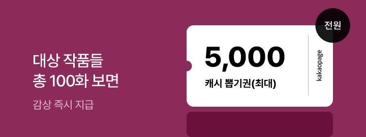 - 이벤트 작품을 총 100화 감상하면 최대 5,000캐시 뽑기권을 즉시 지급합니다. (전원)