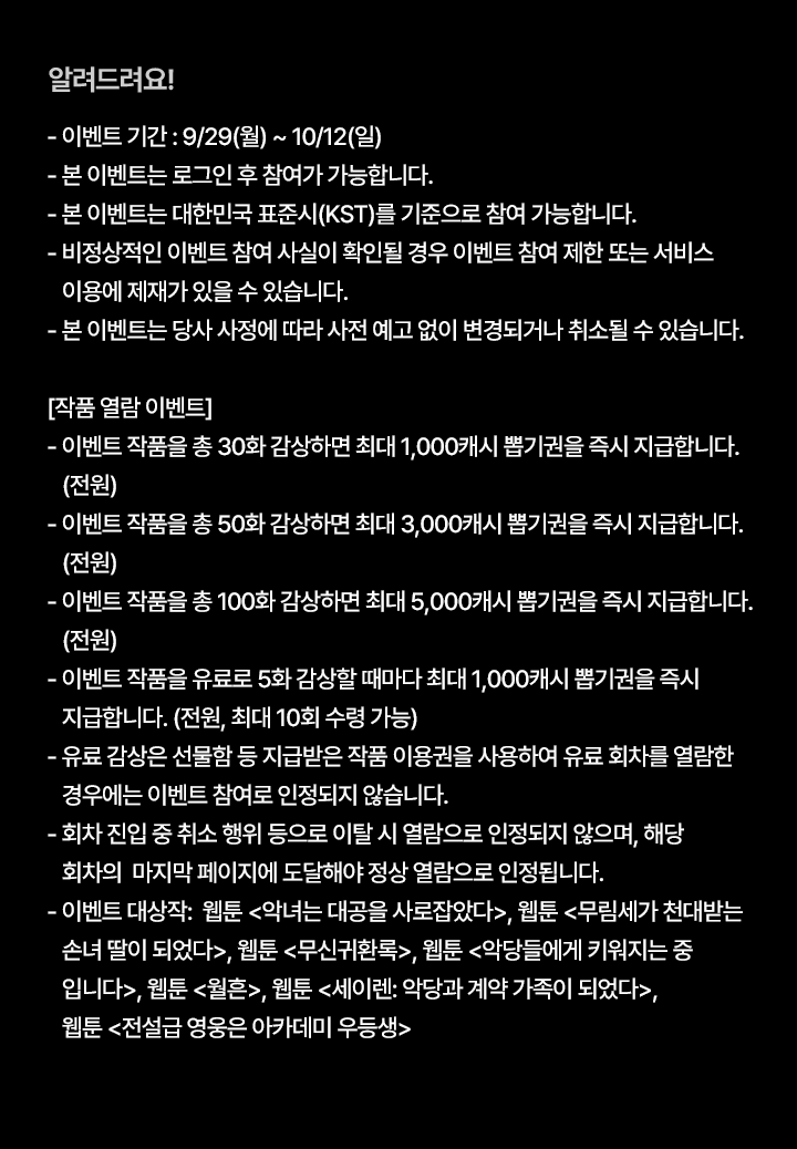 - 이벤트 대상작: 웹툰 <악녀는 대공을 사로잡았다>, 웹툰 <무림세가 천대받는 손녀 딸이 되었다>, 웹툰 <무신귀환록>, 웹툰 <악당들에게 키워지는 중입니다>, 웹툰 <월흔>, 웹툰 <세이렌: 악당과 계약 가족이 되었다>, 웹툰 <전설급 영웅은 아카데미 우등생>