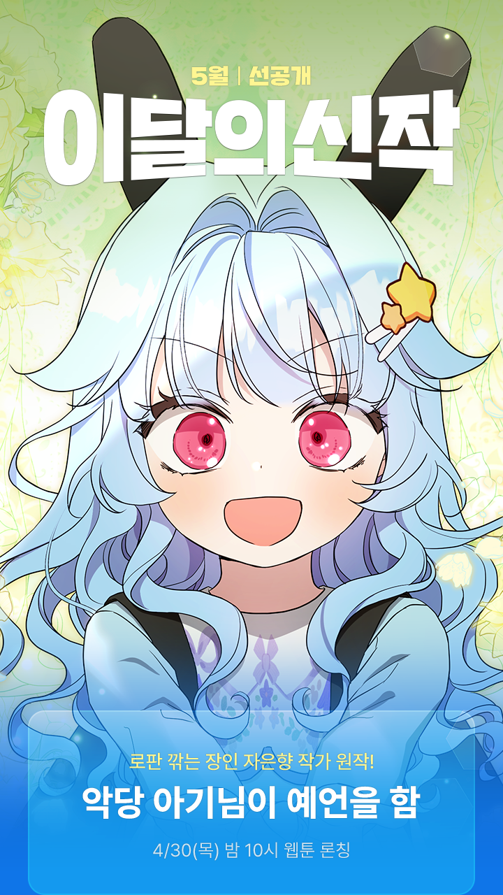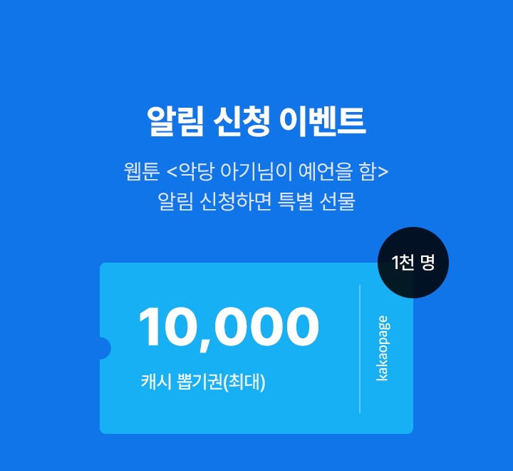 - 웹툰 <악당 아기님이 예언을 함> 알림 신청하신 분들 중 추첨을 통해 1,000명에게 최대 10,000캐시 뽑기권이 지급됩니다. (5/1 푸시로 지급)