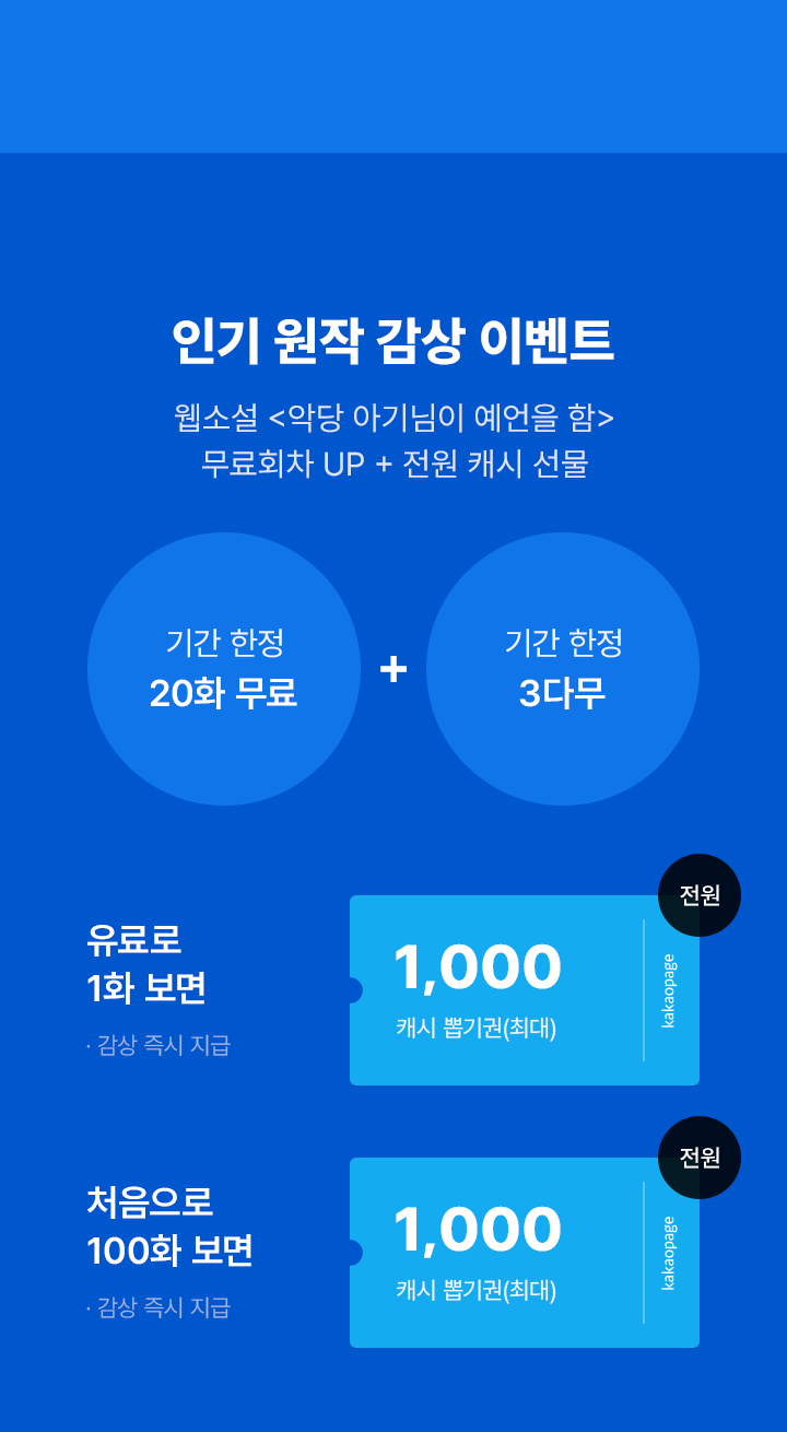 - 처음으로 100화 보면, 최대 1,000캐시 뽑기권 (전원, 감상 즉시 지급)