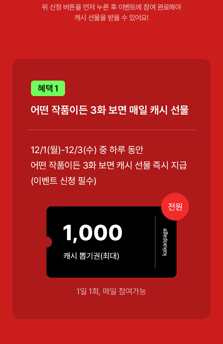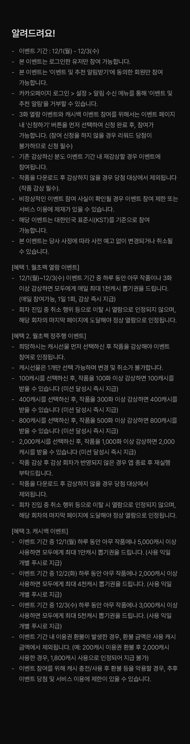 12/1(월)-12/3(수) 중 하루 동안 아무 작품이나 3화 보면 캐시 선물 즉시 지급 (이벤트 신청 필수, 전원, 최대 1,000캐시 뽑기권, 1일 1회, 매일 참여 가능)