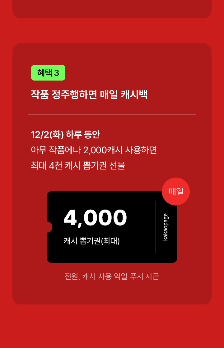 • 12/2(화) 하루 동안 아무 작품에나 2,000캐시 사용하면 최대 4천 캐시 뽑기권 선물 (전원, 캐시 사용 익일 푸시 지급)