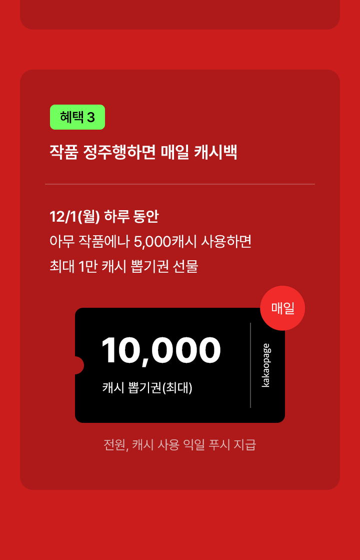 • 12/1(월)~12/3(수) 이벤트 기간 중 하루 동안 아무 작품이나 3화 이상 감상하면 모두에게 매일 최대 1천캐시 뽑기권을 드립니다. (매일 참여가능, 1인 1회, 감상 즉시 지급)