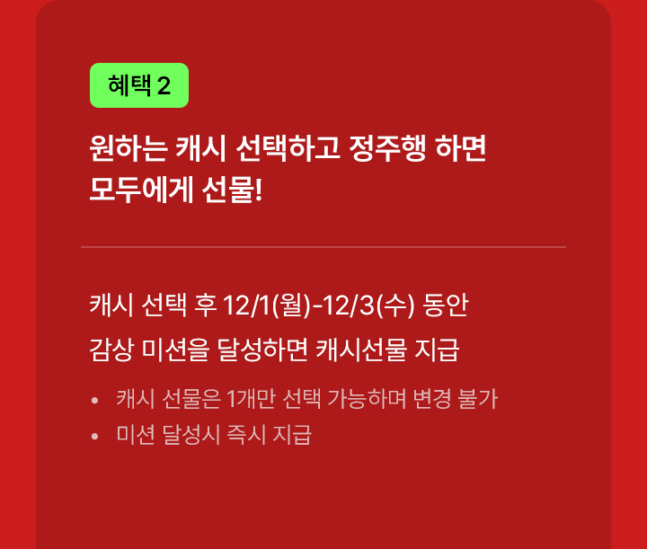 캐시 선택 후 12/1(월)-12/3(수) 동안 감상 미션을 달성하면 캐시선물 지급 (캐시 선물은 1개만 선택 가능하며 변경 불가, 미션 달성시 즉시 지급)