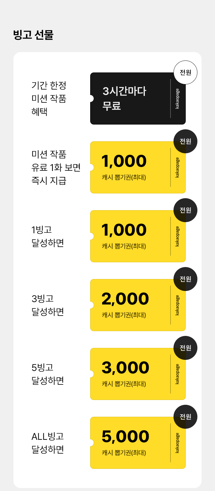 - 5빙고 달성하면 최대 1,000캐시 뽑기권 (전원)