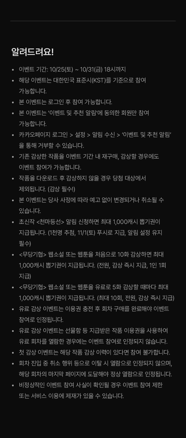 - 유료 감상 이벤트는 이용권 충전 후 회차 구매를 완료해야 이벤트 참여로 인정됩니다.