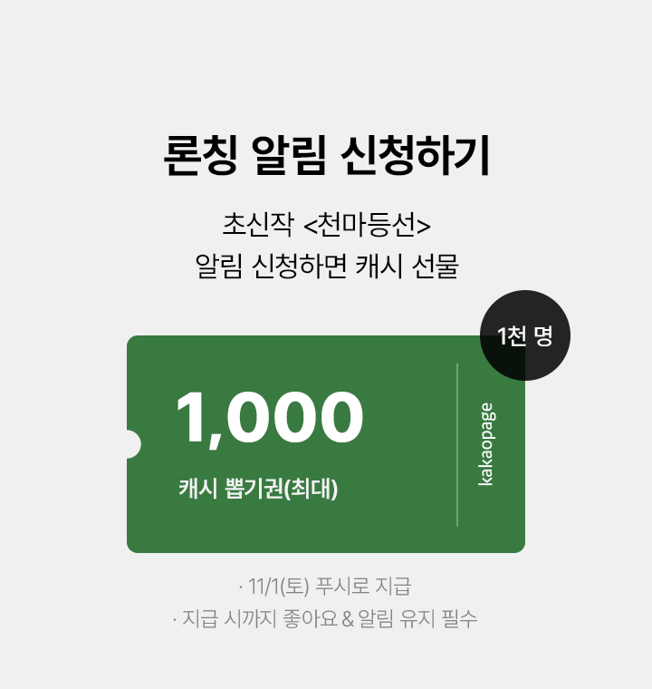 - 초신작 <천마등선> 알림 신청하면 최대 1,000캐시 뽑기권이 지급됩니다. (1천명 추첨, 11/1(토) 푸시로 지급, 알림 설정 유지 필수)