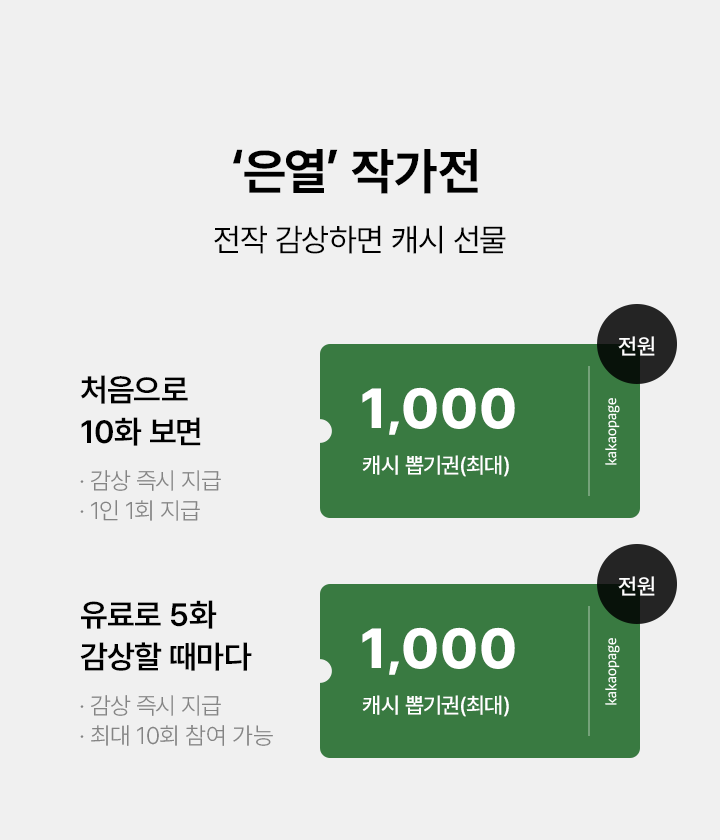 - 유료로 5화 감상할 때마다 최대 1,000캐시 뽑기권 (전원, 감상 즉시 지급, 최대 10회 참여 가능)